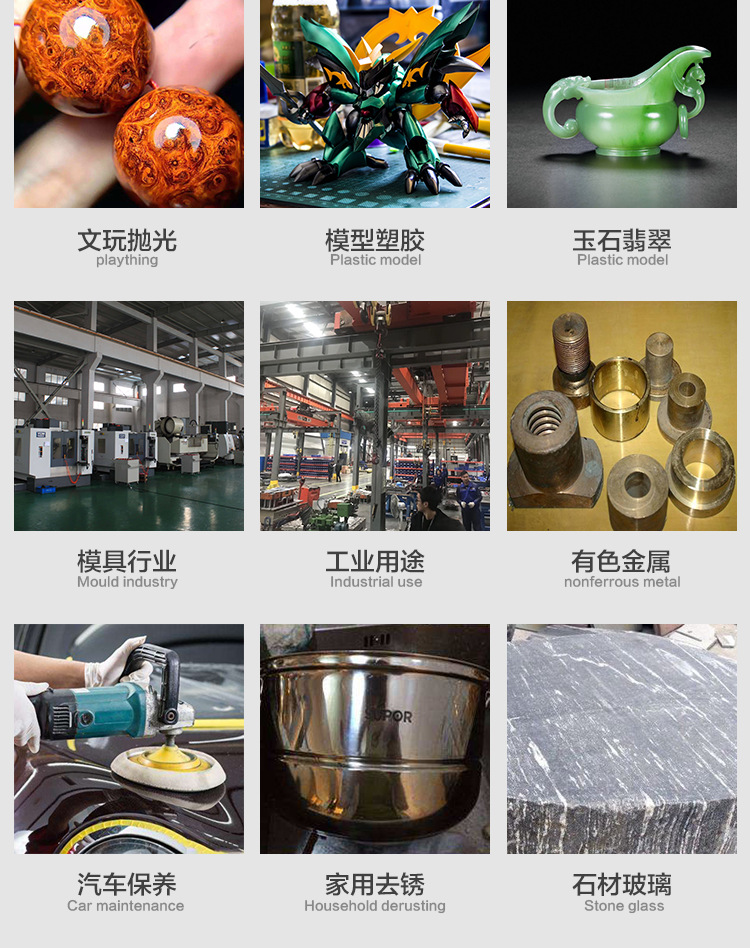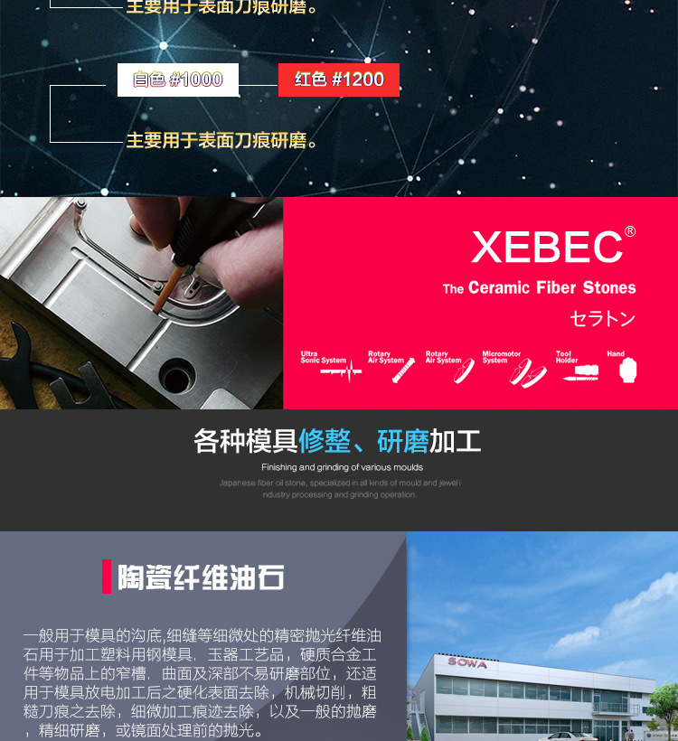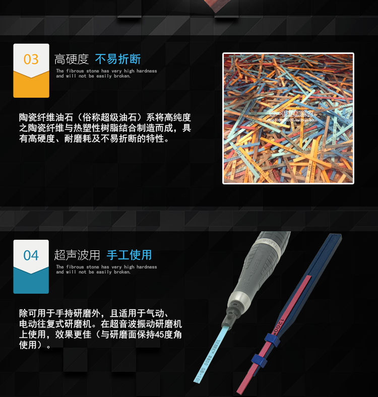 6、除可用于手持研磨外,且適用于氣動(dòng)、電動(dòng)往復(fù)式研磨機(jī)。在超音波振動(dòng)研磨機(jī)上使用,效果最佳(與研磨面保持45度角使用)。陶瓷纖維油石可在各種不同材質(zhì)的模具鋼上研磨加工。最適用于一般難研磨加工處,如窄溝壁、溝底、孔、滑痕、肋部及微小精細(xì)處。尤其對(duì)于放電加工后積碳層的快速去除及拋光效果更佳。