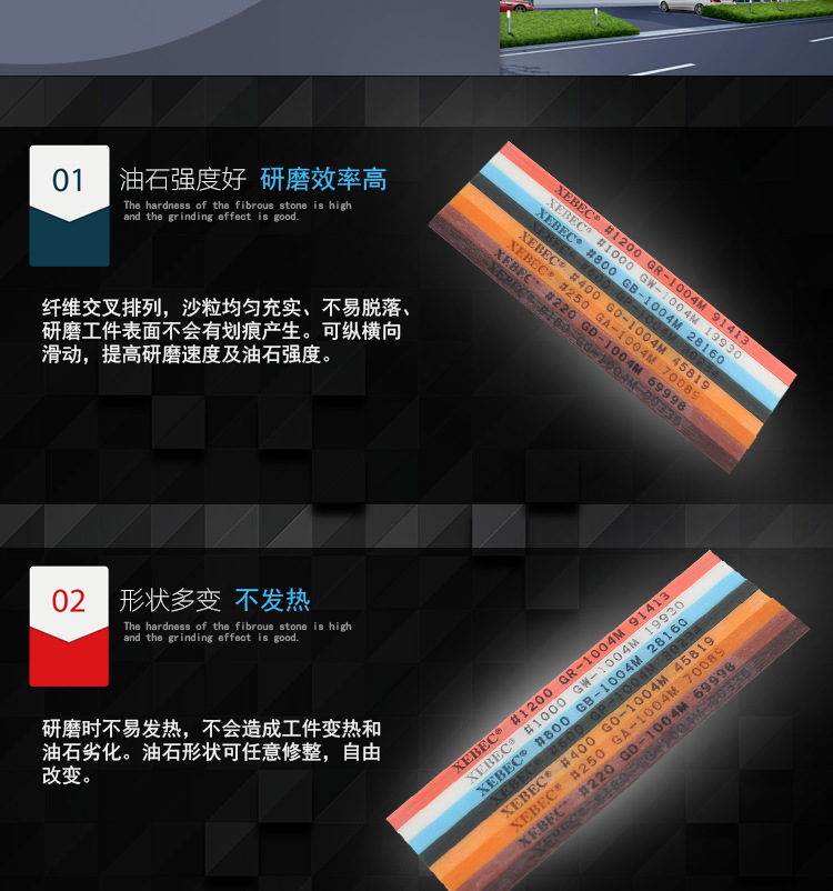 2、纖維交叉排列,沙粒均勻充實(shí)、不易脫落、研磨工件表面不會(huì)有劃痕產(chǎn)生。可縱橫向滑動(dòng),提高研磨速度及油石強(qiáng)度。